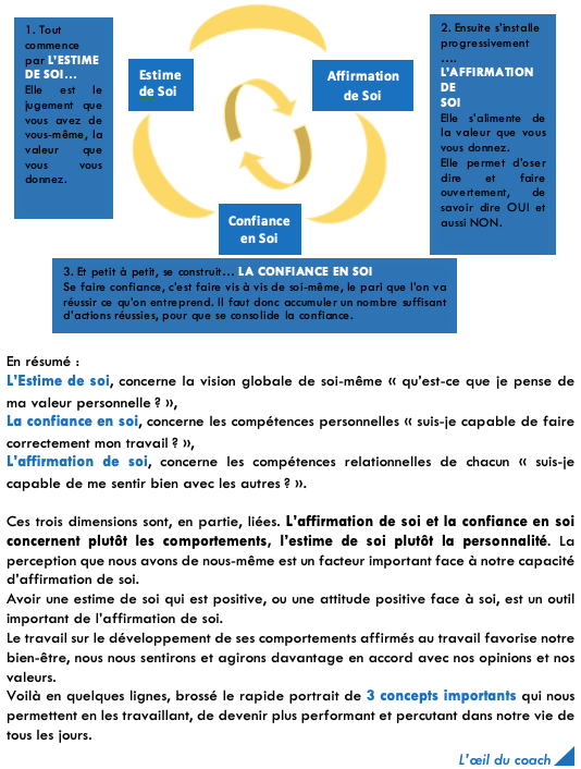 Faire le tri entre Estime, Confiance et Affirmation de soi. Publié parNathalie Genin - EraValues29 octobre 202010 décembre 2020Publié dansL'oeil du CoachÉtiquettes :Affirmation de soi, Confiance en soi, Estime de soi A l’heure où le développement personnel est au cœur des enjeux du bien-être au travail, voulez-vous ressembler au « persona » collectif ou exister en tant qu’individu à part entière évoluant dans ce collectif ? J’aime chargement… Similaire